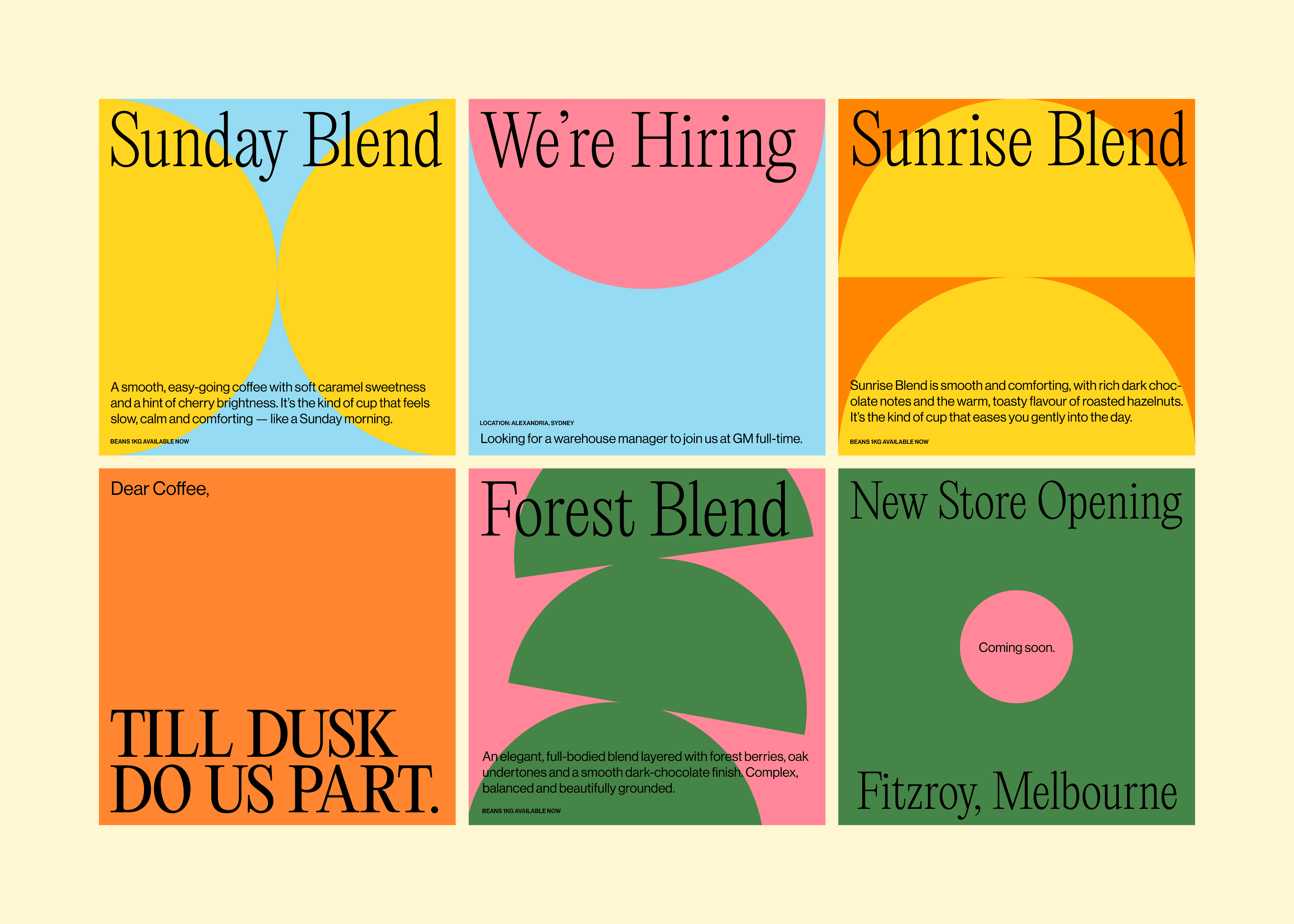 The visual direction pairs soft, sunlit tones with grounded typography and hand-drawn details to evoke a sense of comfort and familiarity. Every touchpoint — from the logo and takeaway cups to the signage and merchandise — reflects the brand’s philosophy: to start each day with intention and good company.