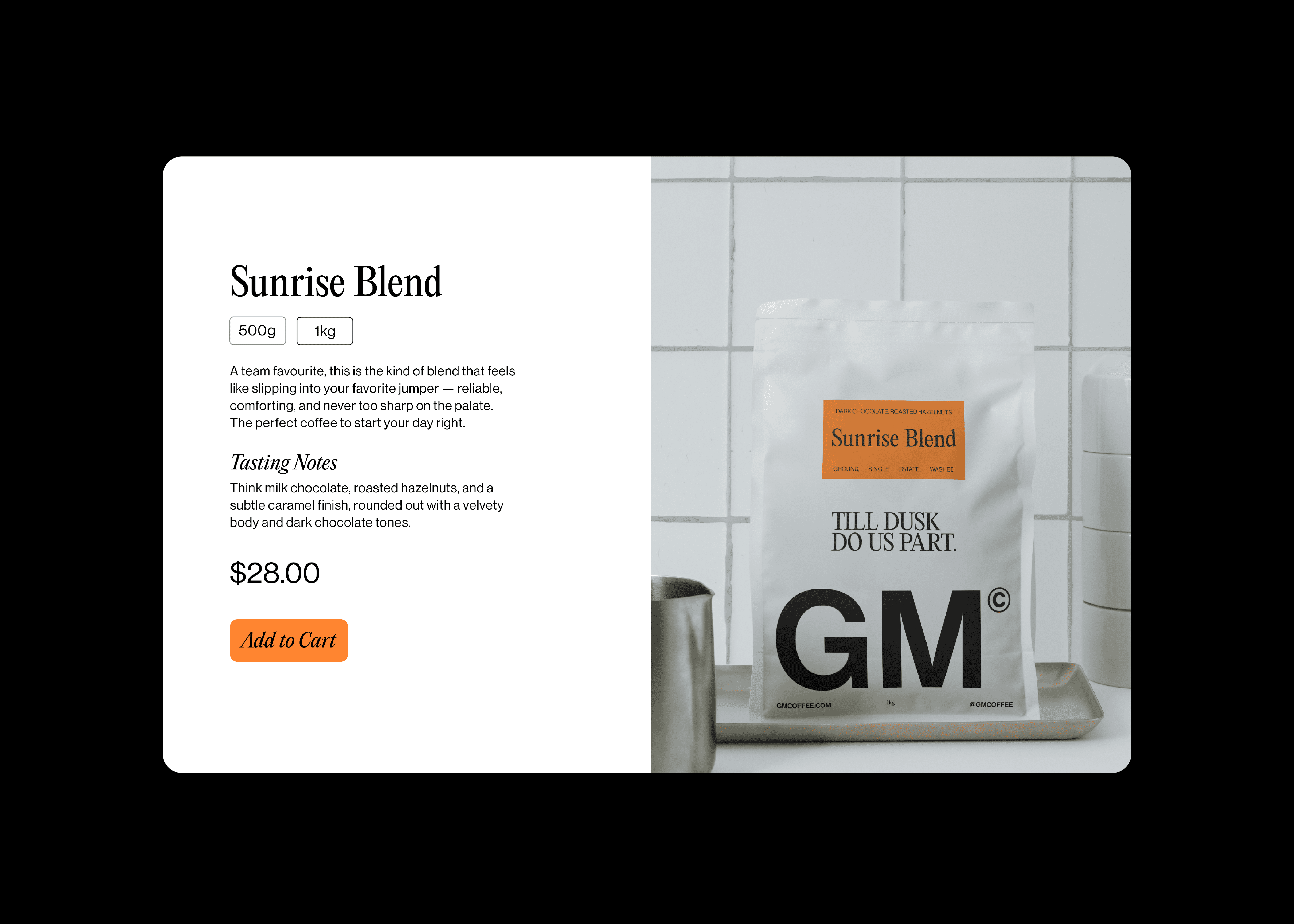 Good Morning Coffee is a neighbourhood café and roastery built around slow mornings, good conversation, and honest coffee. The brand identity captures the warmth of that first cup — approachable, uplifting, and quietly confident.